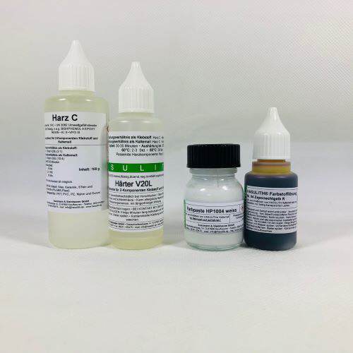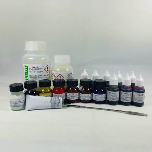 Das Hasulith Kaltemail Probierset enthält 140g Kaltemail fabrlos (100g Harz C + 40g Härter V20L) zzgl. jeweils 25ml Farbpaste und 20ml Farbstofflösung als freie Auswahl aus unserem Farbspektrum. Weitere Farben können selbstverständlich im Shop mitbestellt werden.